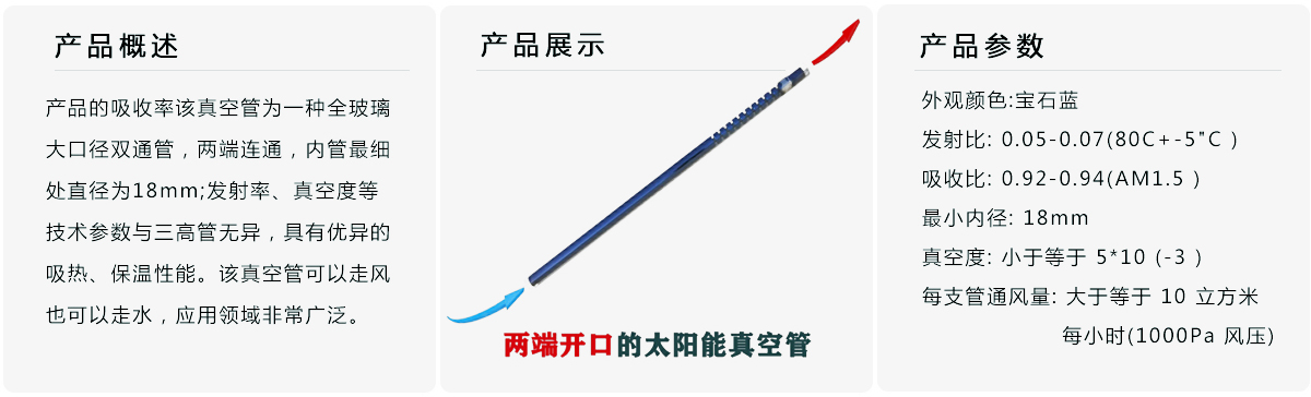 玻璃太陽能雙通管是兩端開口的太陽能真空管。該產品的出現顛覆了很多領域太陽能的應用模式,通過該產品可很容